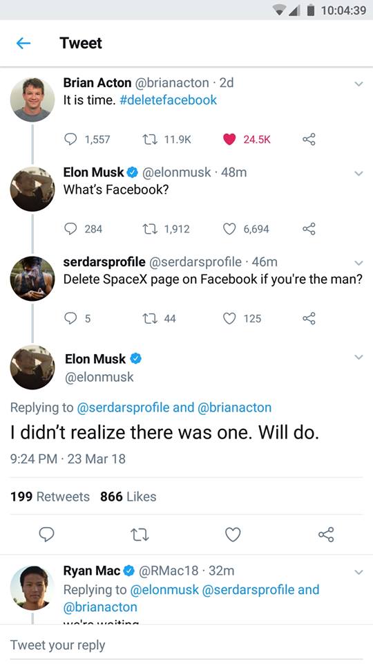 Today SpaceX and Tesla founder Elon Musk replied Brian Acton’s tweet that What’s Facebook? After this tweet many followers asked him to delete both Facebook pages – Tesla and SpaceX which have approx 2.6 million followers.